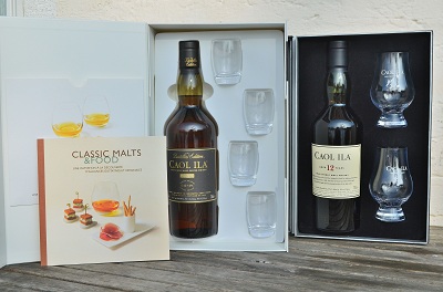 Geschenkverpackungen für 1998 DE und 12yo :Ab und an, vorwiegend Weihnachten, gibt es Sonderverpackungen bei Coal Ila, z.B. die Ausgabe "Classic Malt & Food" (links). In der eleganten Geschenkpackung befinden sich vier kleine, meiner Meinung nach zu kleine, Tumbler mit 'Classic Malts' Aufdruck sowie ein Ratgeber (leider nur auf Französisch) für begleitende Speisen zur "Distillers Edition" 1998. Nachdem ich die 1998er DE Abfüllung noch nicht hatte und die Packung nicht zu teuer war, hab ich mir eine gegönnt. Rechts der normale 12yo in einer Geschenkverpackung mit zwei deutlich größeren und somit besseren Tumblern. |